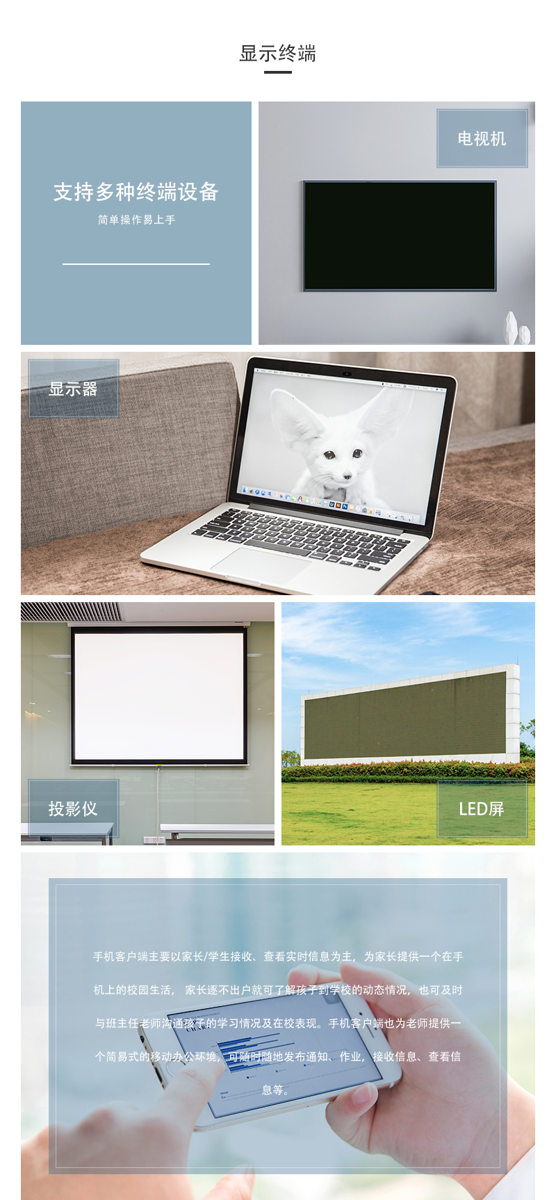 支持電視機、顯示器、投影儀、LED屏、手機端等多種顯示終端,簡單操作易上手。手機客戶端主要以家長/學生接收、查看實時信息為主,家長逐不出戶就可了解孩子到學校的動態(tài)情況,也可及時與班主任老師溝通孩子的學習情況及在校表現。手機客戶端也為老師提供一個簡易式的移動辦公環(huán)境,可隨時隨地發(fā)布通知、作業(yè),接收信息、查看信息等。